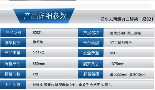 商品名稱:沃爾夫?qū)╓OLFGANG)JZ-821+YT12炭纖維三腳架佳能索尼松下尼康單反微單攝像機(jī)球形云臺(tái)三腳架 炭纖維三腳架沃爾夫?qū)鵍Z-821