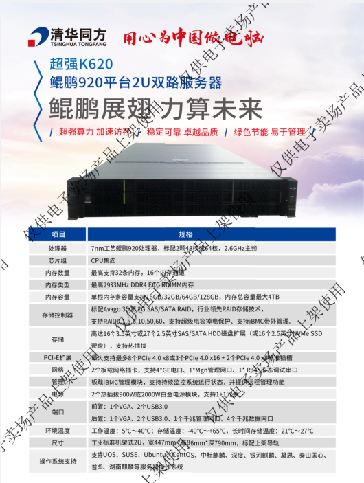 商品名稱(chēng):清華同方(THTF)K620 服務(wù)器 機(jī)架式服務(wù)器 2個(gè)鯤鵬920 7260,64核2.6G處理器*1;32G DDR4-2933 1雙路主板 2U 12個(gè)3.5英寸盤(pán)位Expander機(jī)箱